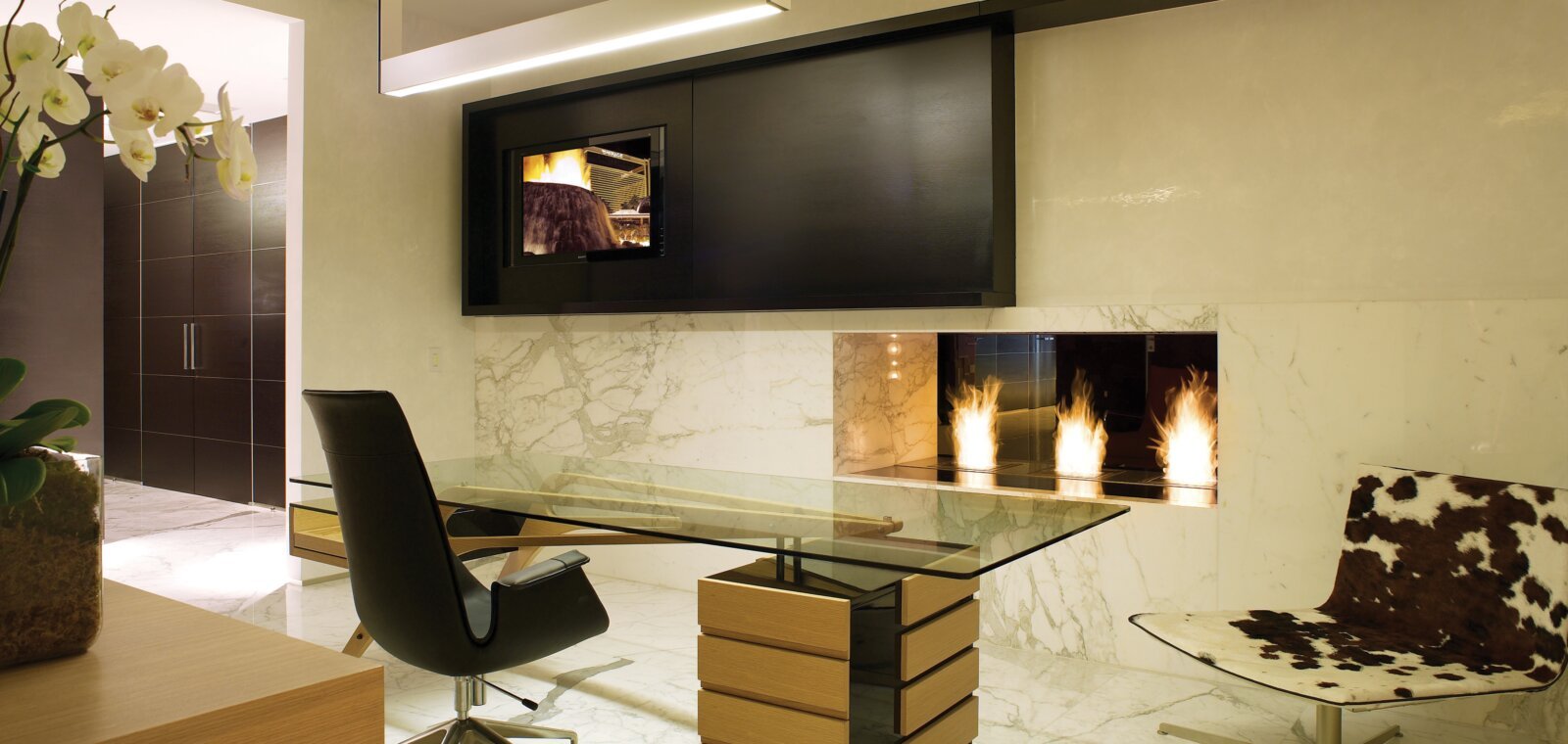 An updated arrangement with a new view may be just what you need to reignite your creativity. Consider adding something new, such as a fireplace. A glowing flame creates a calm and comfortable workspace.